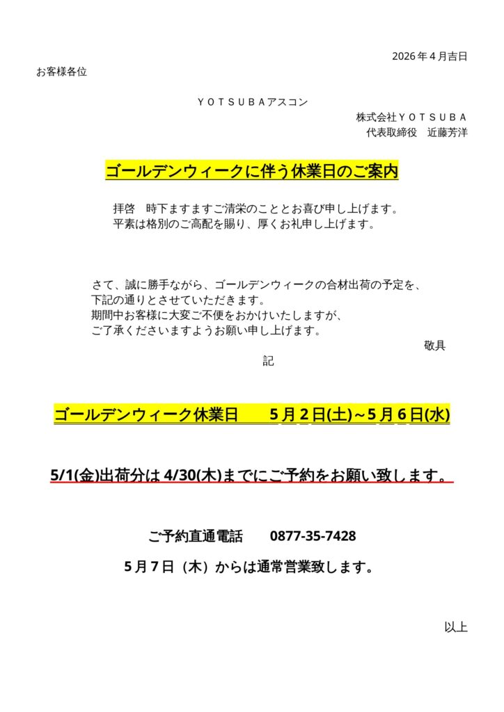合材の出荷を5/2(土)~5/6(水)の間は休業とさせていただきます。